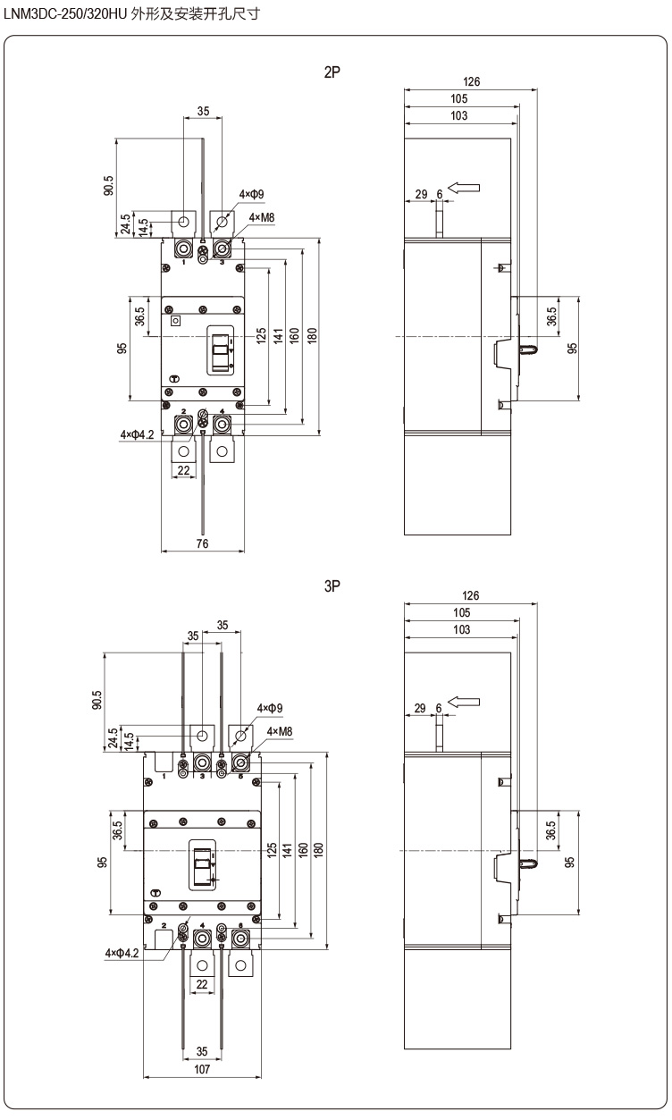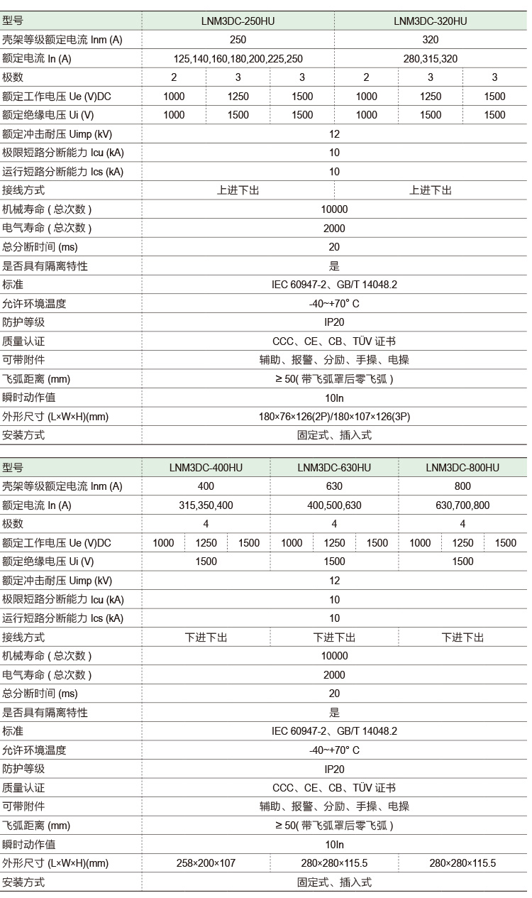 - LNM3DC-HU 系列塑壳断路器,额定电压高至 DC1500V,电流高至 400A。