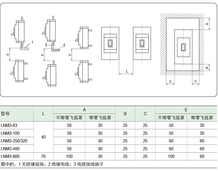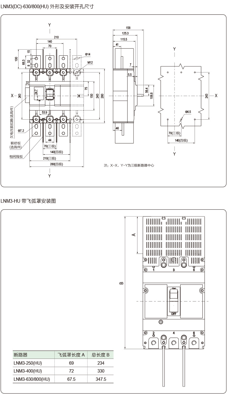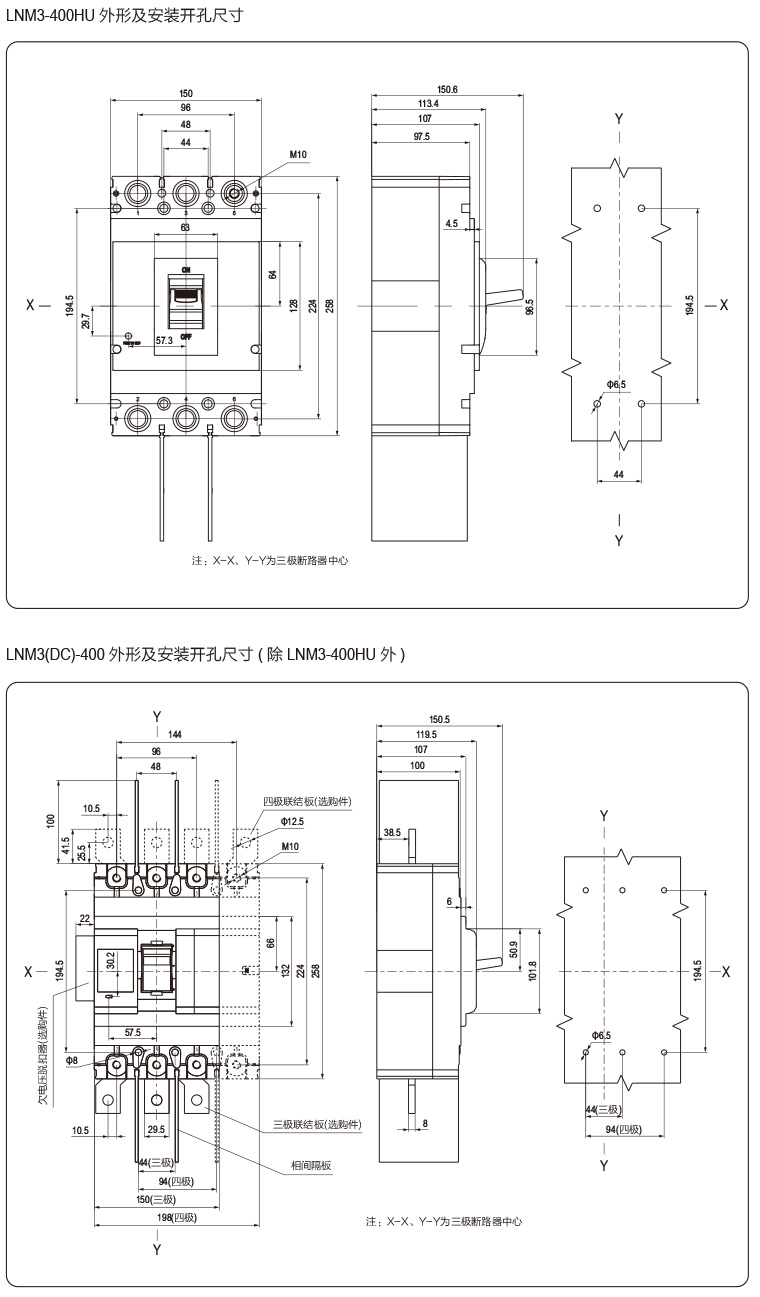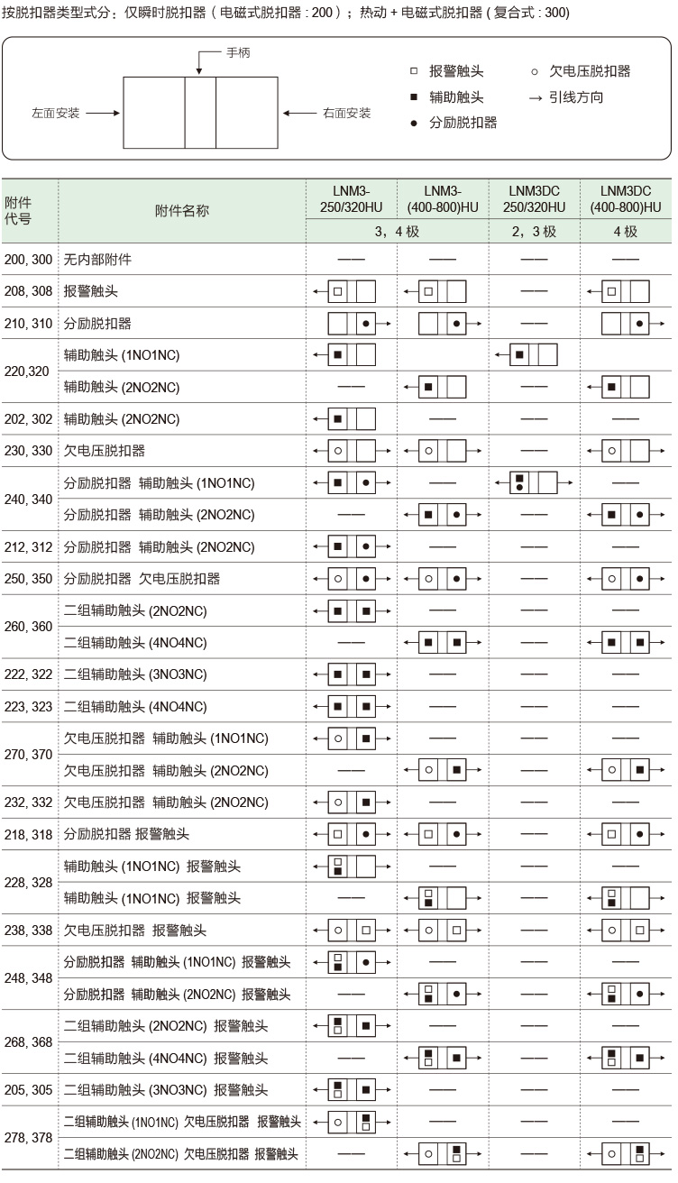 - LNM3-(HU) 系列塑壳断路器,额定电压高至 AC1000V, 电流高至 400A。