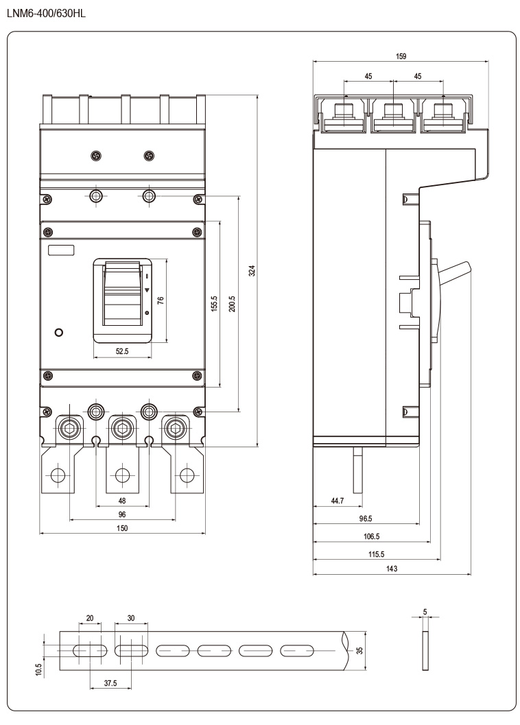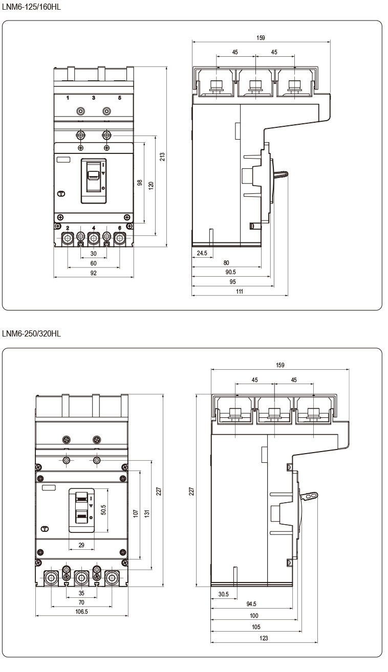 所有壳架产品母线相间距为 45mm,安装可节省 30% 的母线连接材料,缩小 20% 的安装体积,并提升 60%的安装效率。